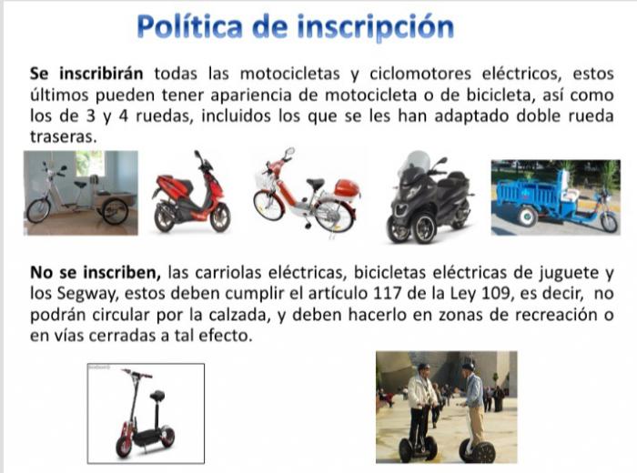 No se inscribirán las carriolas eléctricas, bicicletas eléctricas de juguetes y los llamados Segway, estos tres últimos deben circular en zonas de recreación o vías cerradas.