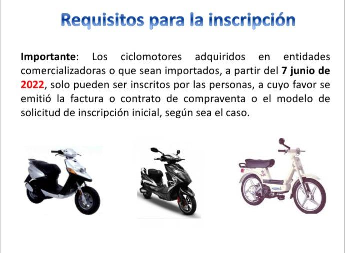 Los ciclomotores adquiridos en entidades comercializadoras o que sean importados a partir del 7 de junio de 2022 solo pueden ser inscritos por las personas a cuyo nombre se emitió la factura o contrato de compraventa o el modelo de solicitud de inscripción inicial, según el caso.