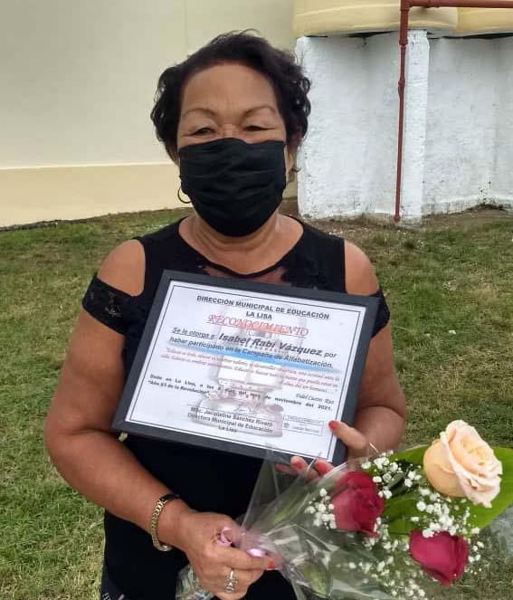 La viceministra de Educación, Cira Piñero Alonso, entregó un reconocimiento a la alfabetizadora Isabel Rabí Vázquez.