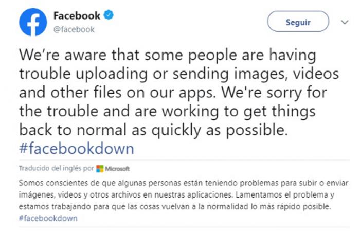 La empresa dirigida por Mark Zuckerberg aseguró que están trabajando para que todo se solucione y vuelva a la normalidad lo más rápido posible y afirman que: "Somos conscientes de que algunas personas están teniendo inconvenientes para subir o enviar imágenes, videos y otros archivos en nuestras aplicaciones. Lamentamos el problema y estamos trabajando para que las cosas vuelvan a la normalidad lo más rápido posible", se lee en la mencionada red social.