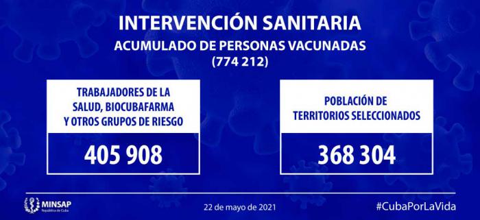 Al cierre del 22 de mayo se acumulan 774 mil 212 personas vacunadas, de ellos 405 mil 908 como parte de los trabajadores de la salud, BioCubaFarma y otros grupos de riesgo; y 368 mil 304 como parte de la población de los territorios seleccionados.