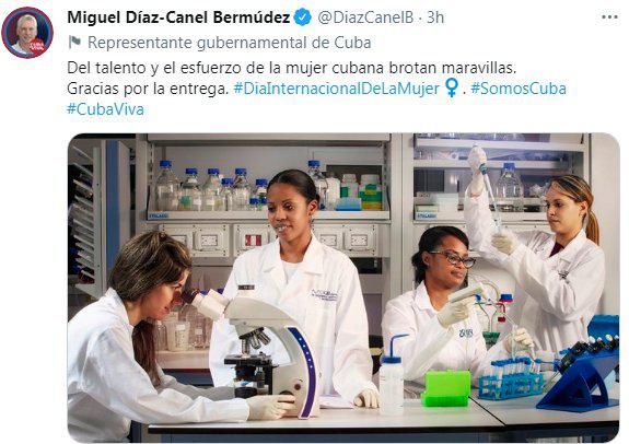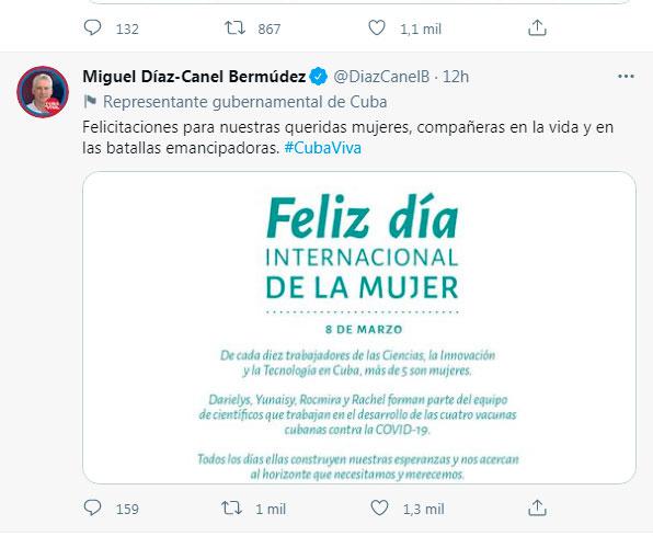 “#Cuba seguirá luchando por todos los derechos para la Mujer, a quien debemos la vida y gran parte de la obra que sostiene a la Revolución. En el #DiaInternacionalDeLaMujer pensemos cuánto más podemos hacer. #SomosCuba #CubaViva”, escribió.