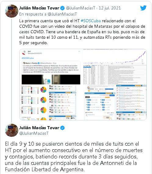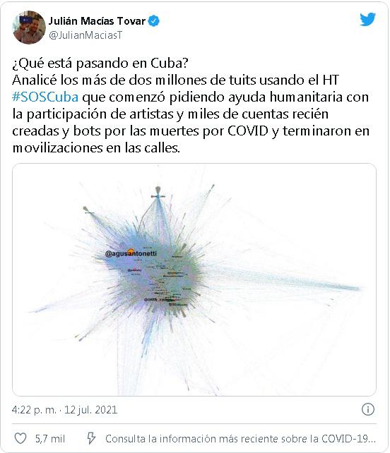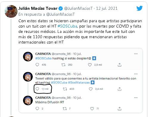 Tovar señala en su acuciosa pesquisa que se hicieron campañas para que artistas participaran con un tuit con el HT #SOSCuba, por las muertes por COVID y falta de recursos médicos. Para ello se presentó un tuit que recibió más de 1 100 respuestas. Una cosa llamativa es que si se analizan esas respuestas, casi todas provienen de cuentas recién creadas, o tienen una antigüedad máxima de un año. Más de 1 500 cuentas de las que participaron en la operación con la etiqueta #SOSCuba fueron creadas entre el 10 y el 11 de julio.