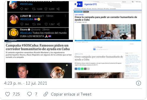 Muchos artistas con millones de seguidores participaron, poniendo en la mayoría un tuit solo con el HT #SOSCuba, sin ningún texto acompañando. Pero la mayoría de medios internacionales hablaron de que los famosos pedían un corredor humanitario.