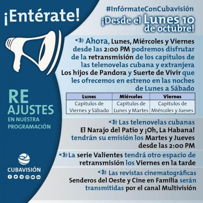 Cubavisión, El canal de todos, anunció en su cuenta oficial de Facebook, el inicio de ajustes en su programación, desde este lunes 10 de octubre.