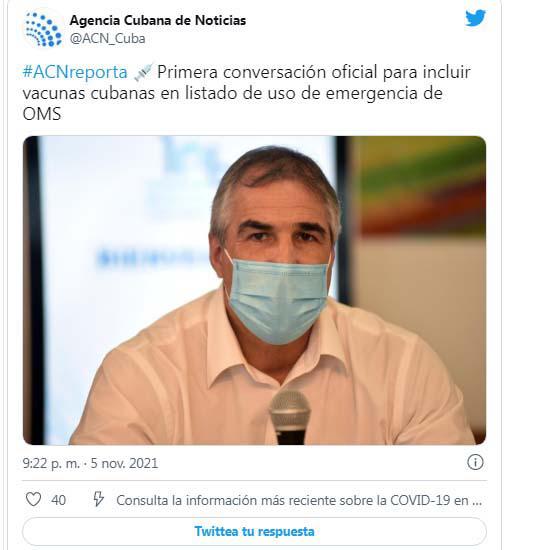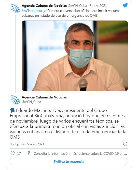 Eduardo Martínez Díaz, presidente del Grupo Empresarial BioCubaFarma, anunció hoy que en este mes de noviembre, luego de varios encuentros técnicos, se efectuará la primera reunión oficial con vistas a incluir las vacunas cubanas en el listado de uso de emergencia de la Organización Mundial de la Salud.