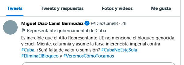 En su perfil oficial en Twitter, el mandatario cubano expresó que esta postura es otra demostración del apoyo de la UE a la farsa injerencista imperial contra la mayor de las Antillas.