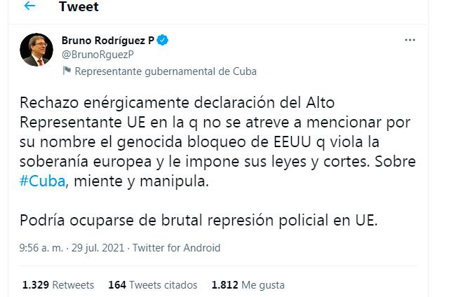 En la propia red social, varios diplomáticos cubanos, entre ellos, el ministro de Relaciones Exteriores, Bruno Rodríguez Parrilla, condenaron esta postura de Borrell.