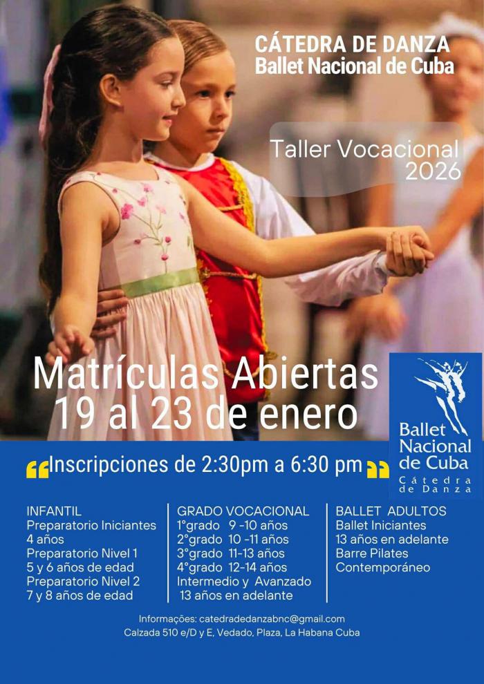 El Taller Vocacional del Ballet Nacional de Cuba tiene abiertas sus matrículas en el horario de 2:30 pm a 6:30 pm.