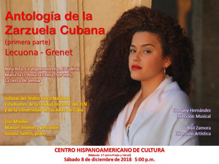 Presentación este sábado 8 de diciembre del concierto "Antología de la Zarzuela Cubana", como parte de un proyecto para la recuperación patrimonial del Teatro Lírico Cubano. Fragmentos de las zarzuelas "Niña Rita", "La virgen morena", "El Cafetal", "María la O", "Rosa la China", "Sor Inés" y "La tierra de Venus" podran ser escuchados en las voces de las sopranos Dayri Llanes, Teresa Yanet Senra, Ariagna Reyes, Lucía Llanes y Fátima Navarro; las mezzosopranos Dayamí Pérez y Merlyn Cruz; los tenores Irelio Pérez, Reynier Borrego, Mario Peñafuerte, Jorge Dariel Soriano y Félix Román; el barítono Reynaldo Cobas y el bajo Marcos Lima. Este espectáculo, dedicado en esta ocasión a obras de Ernesto Lecuona y Eliseo Grenet, es el primero de una serie que reunirá romanzas y dúos de títulos relevantes de nuestra escena lírica, algunos de muy poca divulgación en la actualidad.