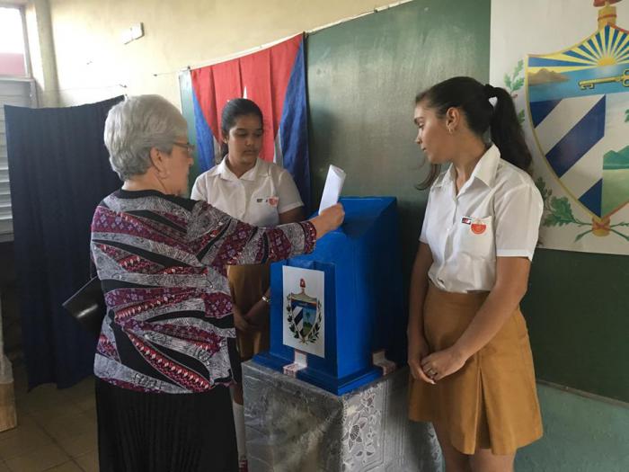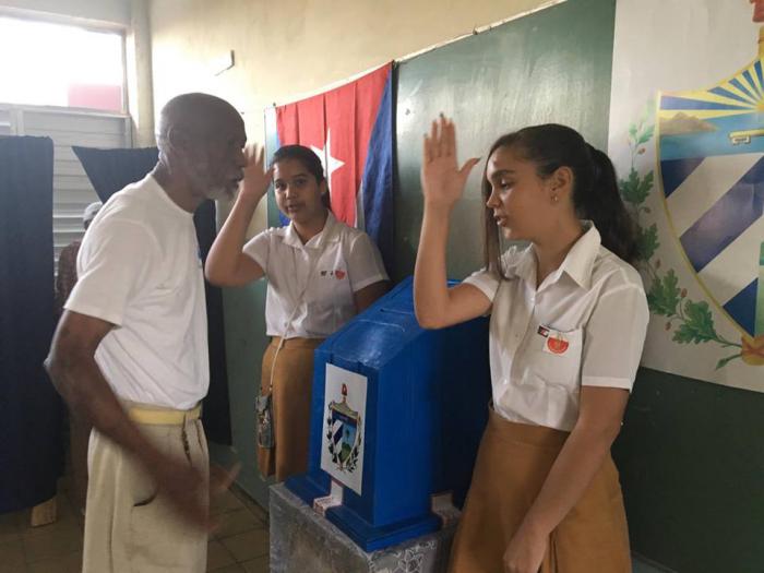 Al otro extremo de la mesa la estudiante de secundaria básica Gelina Denís Núñez se siente importante cuando custodia las urnas, “por que participo en las cosas de mi país, y siento que yo también puedo cuidar a la Patria”.