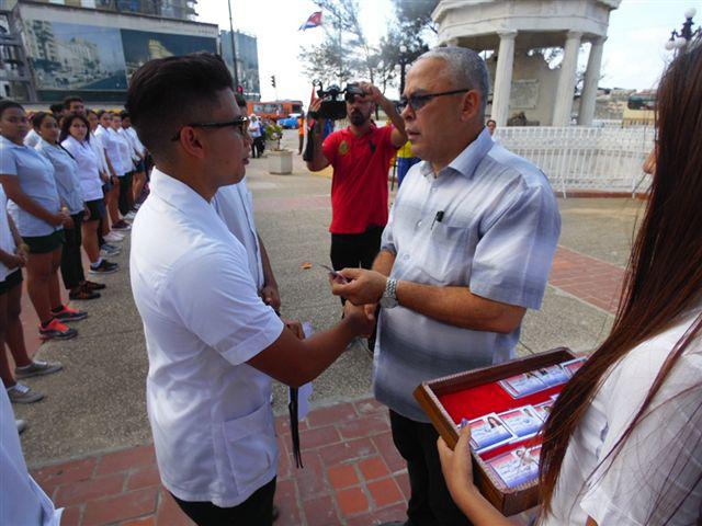 Luego de que dos estudiantes extendieran las cintas de la ofrenda floral colocada en el sitial que rinde homenaje de recordación a los 8 estudiantes de medicina asesinados por el colonialismo español, y de escuchar las notas del Himno Nacional, Torres Iríbar, junto al Prof. Dr. Luis Alberto Pichs García, rector de la UCMH, Aylin Álvarez García, Secretaria General de la UJC en La Habana y otros directivos y destacados profesores de la Facultad de Ciencias Médicas Enrique Cabrera, hicieron entrega de los carnés que acreditan la condición de militantes de la UJC a este grupo de jóvenes capitalinos.
