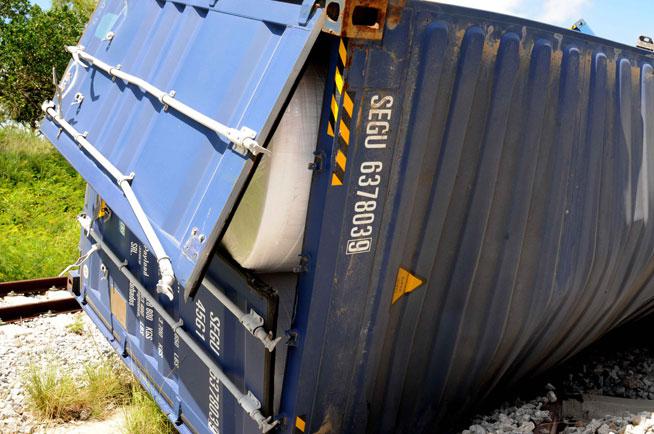 La locomotora y los carros descarrilados son de fabricación reciente y moderna.