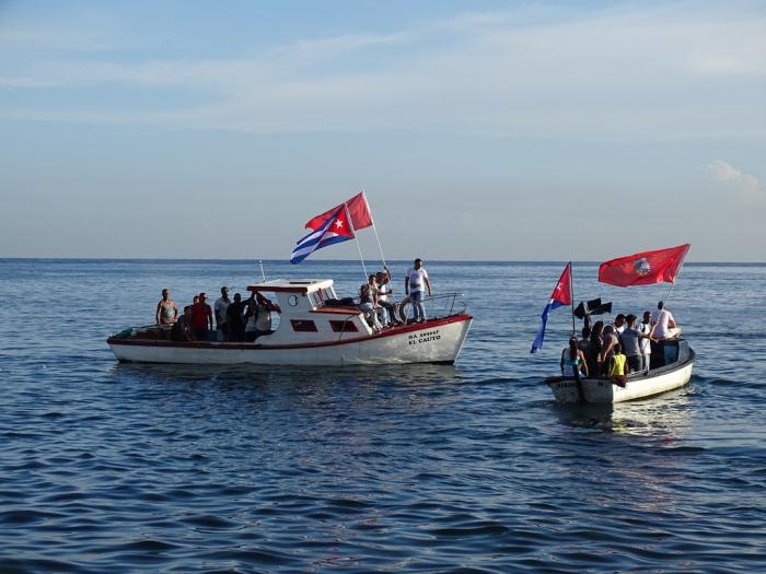 Jóvenes capitalinos se echaron al mar para, desde las lanchas, ofrecerles flores a los héroes de la Patria en una fecha tan significativa como este 30 de julio, Día de los Mártires de la Revolución.