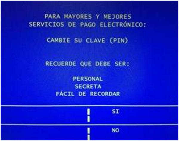 Se sugiere a los clientes elegir previamente un número personal, secreto y fácil de recordar para poder realizar el cambio de clave (PIN) al ser solicitado en una de las pantallas del cajero automático.