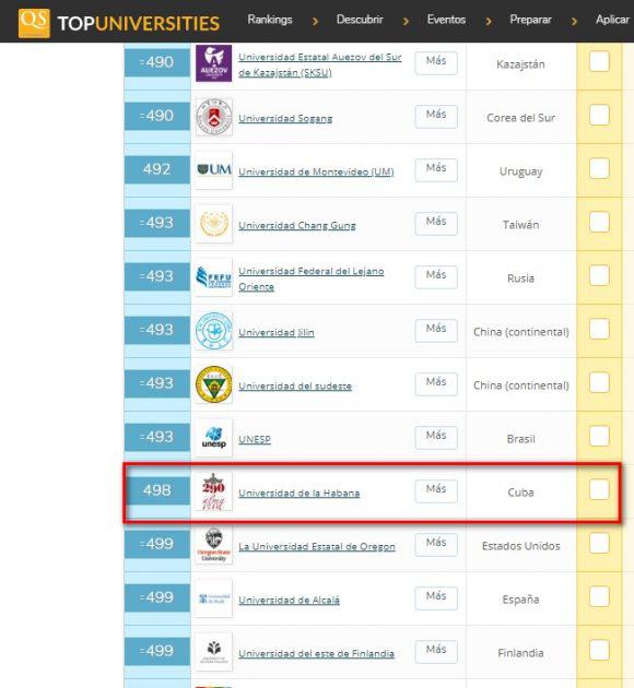 La UH ha superado a la Universidad del Estado de Oregón y de Alcalá (ambas en el puesto 499). Se ubica justo luego de la UNESP (puesto 493).