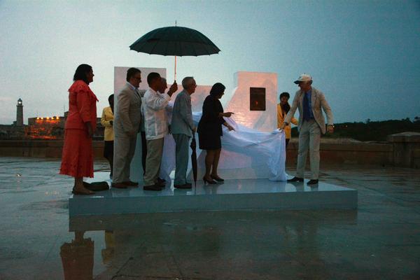 En la explanada del Castillo de San Salvador de la Punta, monumento Patrimonio de la Humanidad, a la entrada de la bahía, bajo una lluvia persistente, se develó el monumento y la placa conmemorativa que refrendan el reconocimiento otorgado.
