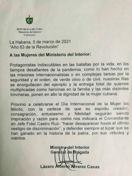 El General de Brigada Lázaro Alberto Álvarez Casas, ministro del Interior, envió recientemente una carta de felicitación a las mujeres de la institución armada con motivo del Día Internacional de la Mujer, que se celebra este 8 de marzo.