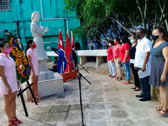 Una ofrenda floral a nombre del Sindicato Nacional de los Trabajadores del Comercio, la Gastronomía y los Servicios, fue colocada en el monumento escultórico erigido en el lugar en memoria de Fe Isabel del Valle Ramos, quien pereció heroicamente tratando de salvar los bienes del pueblo.