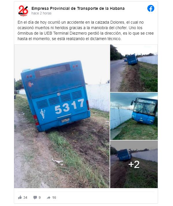 “Este martes ocurrió un accidente en la calzada Dolores, el cual no ocasionó muertos ni heridos gracias a la maniobra del chofer”, informó a través de sus redes sociales la empresa provincial de Transporte en La Habana.