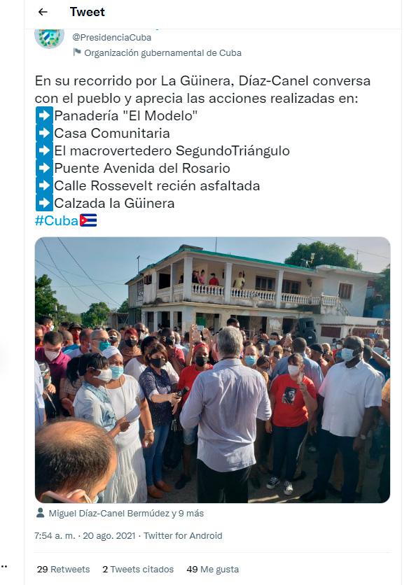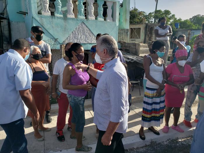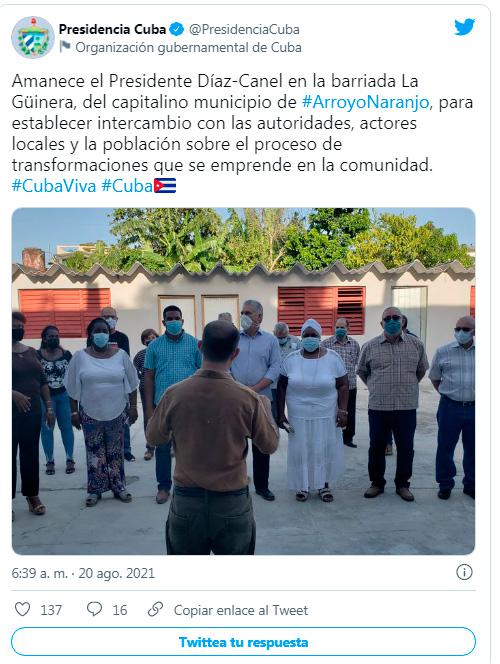 “Amanece el Presidente Díaz-Canel en la barriada La Güinera, del capitalino municipio de #ArroyoNaranjo, para establecer intercambio con las autoridades, actores locales y la población sobre el proceso de transformaciones que se emprende en la comunidad. #CubaViva #Cuba”, afirma el comunicado.