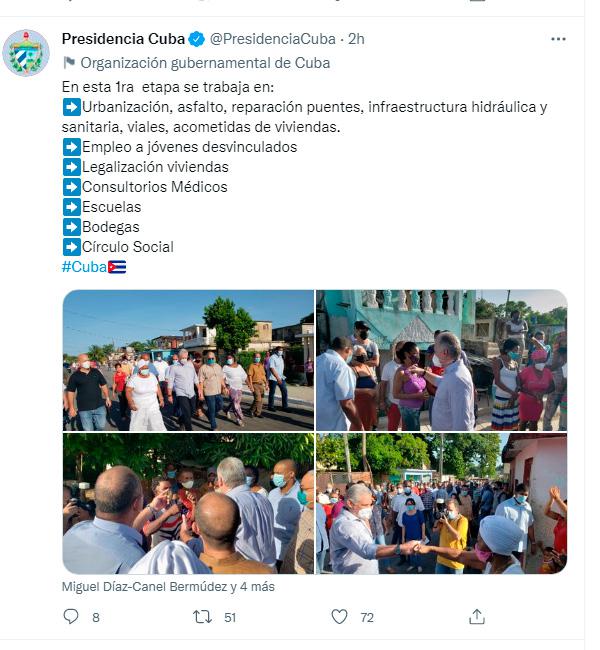 “Con el concepto de apoyo a la comunidad, diversas entidades estatales junto a la población y actores locales, acometen acciones de mejoramiento de la infraestructura vial, hidráulica, civil, así como de instituciones de salud, educacional y sociales. #CubaViva #Cuba”, dice la Presidencia en la propia red social.