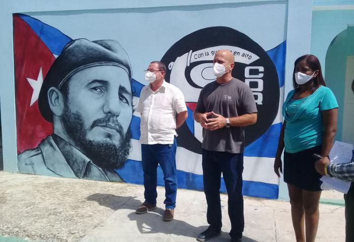 La pintura mural muestra la imagen del Líder Histórico de la Revolución Cubana y el logo de la organización cederista.
