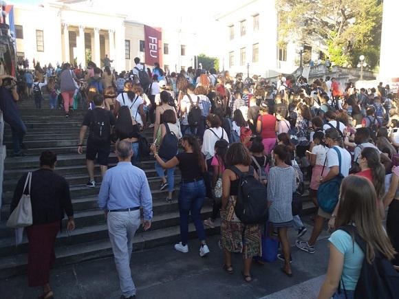 Este martes 3 de noviembre la Universidad de La Habana recibió a los estudiantes de primer año del curso diurno. Desde el Memorial Mella, en la céntrica esquina de L y la calle San Lázaro, los jóvenes ascendieron la escalinata de la Casa de Altos Estudios, una simbólica tradición que ha pasado de generación en generación de universitarios.