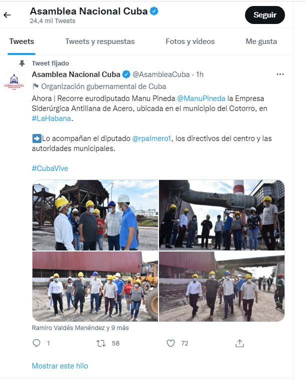 "Ahora | Recorre eurodiputado Manu Pineda @ManuPineda la Empresa Siderúrgica Antillana de Acero, ubicada en el municipio del Cotorro, en #LaHabana. Lo acompañan el diputado @rpalmero1, los directivos del centro y las autoridades municipales. #CubaVive", tuiteó la Asamblea.