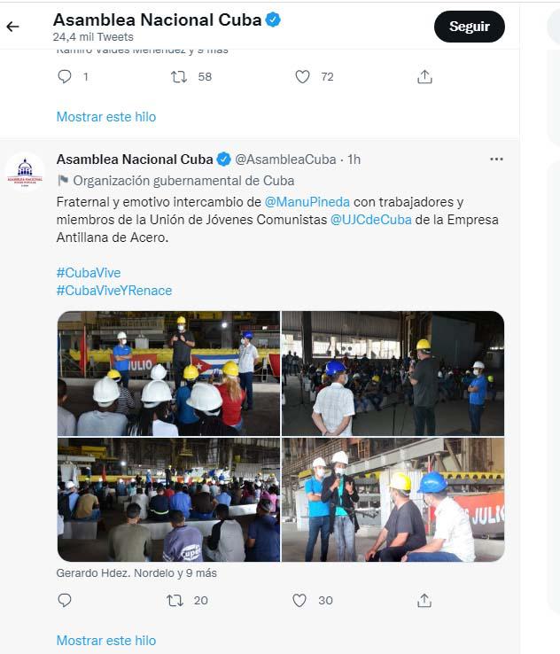 "Fraternal y emotivo intercambio de @ManuPineda con trabajadores y miembros de la Unión de Jóvenes Comunistas @UJCdeCuba de la Empresa Antillana de Acero", refiere el tuit.