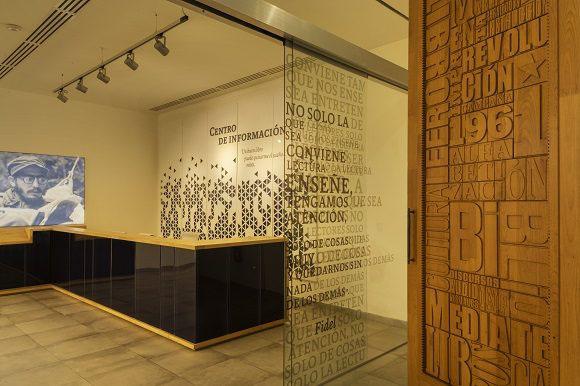 Cuentan en el centro ―según recuerdos de Katiuska Blanco― que Fidel era muy celoso de sus libros, prestaba uno y a los dos días ya lo estaba pidiendo de vuelta. “Un buen libro puede quitarme el sueño”, se lee justo antes de una foto de Fidel leyendo en la Sierra. A la entrada, una puerta tallada en madera anuncia los elementos que exhibe la biblioteca (entrevistas, manuscritos, libros, etc.).