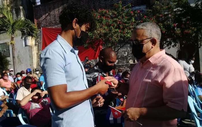 En el acto, una representación de trabajadores destacados recibieron el carné de militantes del Partido Comunista de Cuba.