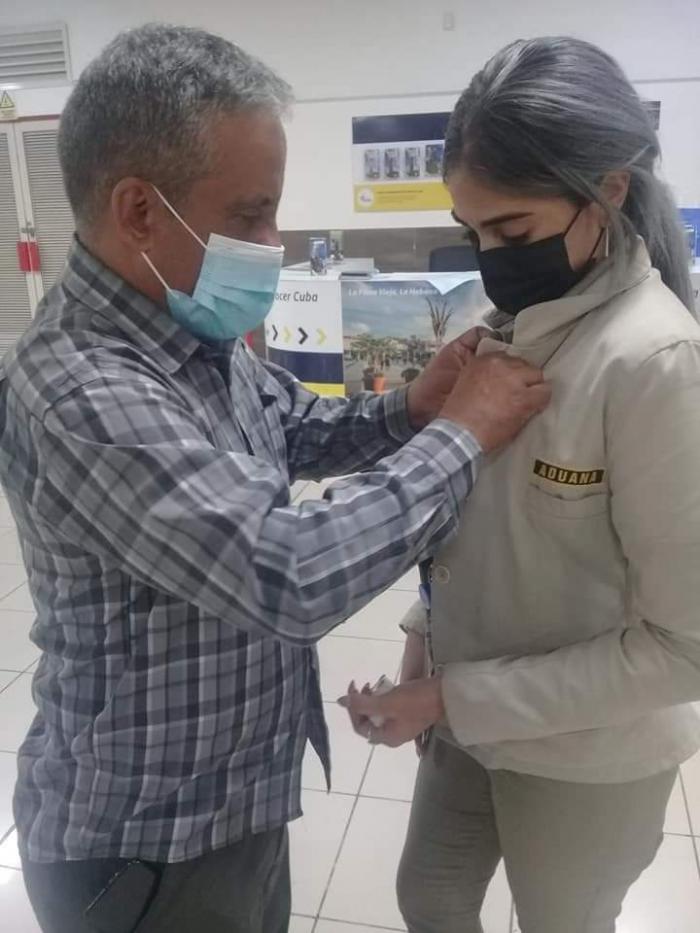 Tenía la encomienda de colocar en su uniforme el Sello de Honor conferido por la Aduana General de la República, en su área de trabajo de la terminal 3 del Aeropuerto Internacional José Martí, donde se desempeña como Jefe de Turno de la Brigada 8, para reconocer su ejemplo de sacrificio y entrega al trabajo especializado.