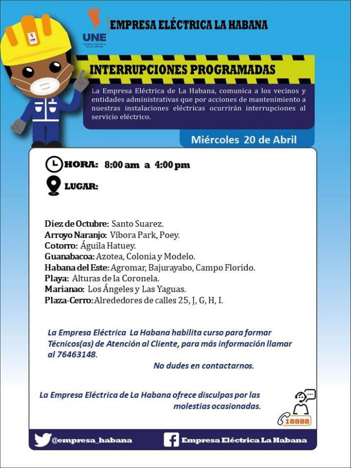 La Empresa Eléctrica de la capital comunica las afectaciones que ocurrirán este 20 de abril por acciones de mantenimiento en sus instalaciones