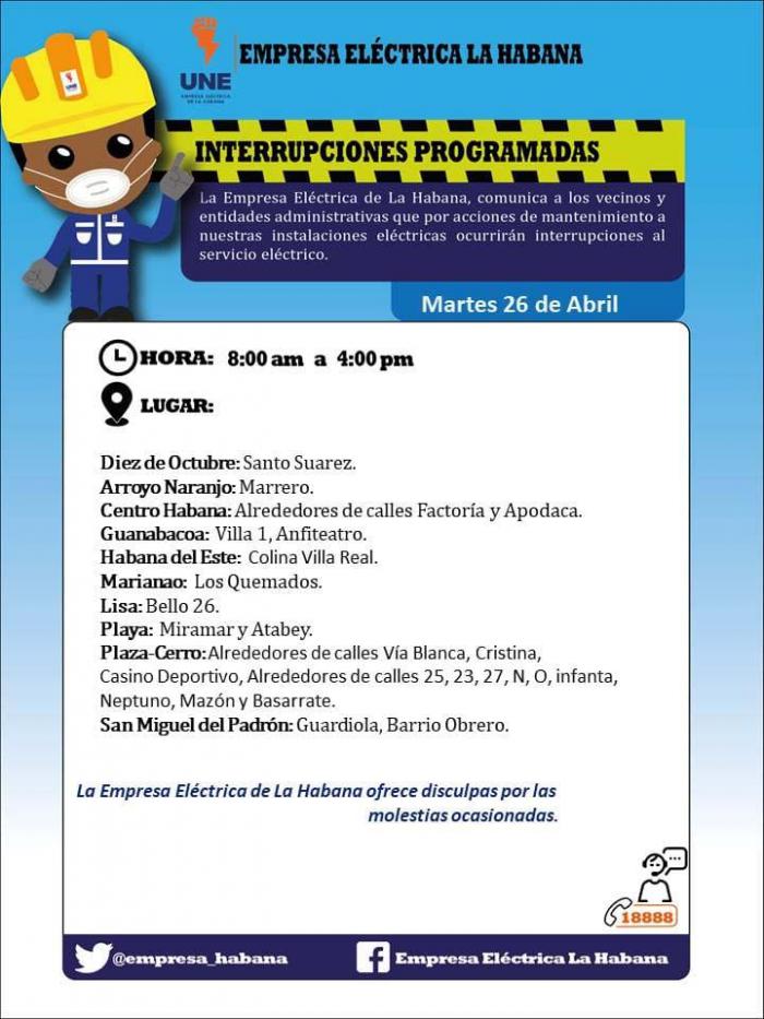 La Empresa Eléctrica de la capital comunica las afectaciones que ocurrirán este 26 de abril por acciones de mantenimiento en sus instalaciones