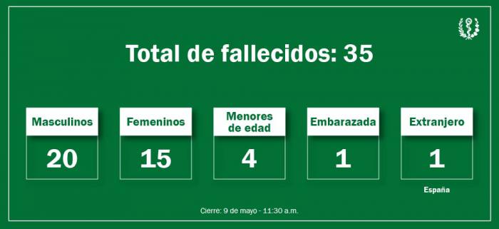 Hasta el momento se reportan 35 fallecidos, uno de ellos en proceso de identificación. Lamentamos profundamente lo sucedido y trasmitimos nuestras condolencias a sus familiares y amigos.