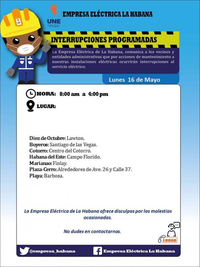 Interrupciones en el servicio eléctrico para el lunes 16 de mayo
