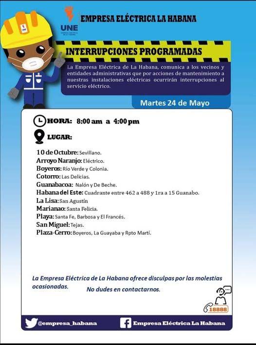 Estimado Redactor, No entiendo nada su eslogan: Apostamos por un periodismo multimedia de calidad, cada vez más atrevido, más parecido a nuestros tiempos y a los capitalinos. Esta noticia (bueno, si se le puede llamar noticia!) es de las más ambiguas, imprecisas y cortas que he visto en este sitio web! Sólo amenaza con apagón mañans 24 en horiario de trabajo, pero va a ocurrir en toda la capital? Lo dudo porque se detendría la capital de todos los cubanos. Qué estrategia va a seguir la Unión Eléctrica en La Habana? Cuál será la prioridad? Plaza y Playa? Van s sispender el trabajo en La Habana?