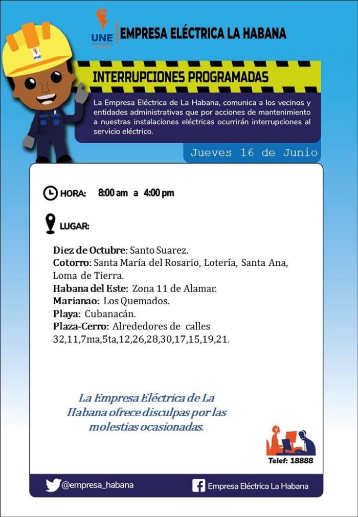 Interrupciones eléctricas para el jueves 16 de junio en La Habana