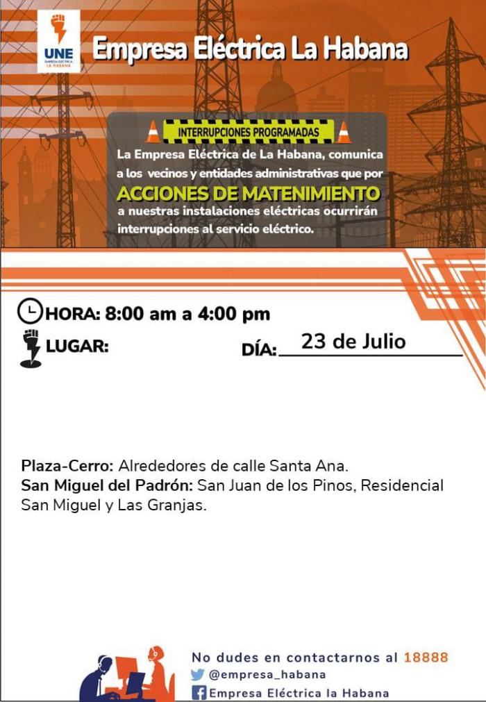 Por acciones de mantenimiento a las instalaciones eléctricas ocurrirán interrupciones del servicio en el horario comprendido entre las 8:00 a.m. y las 4:00 p.m.