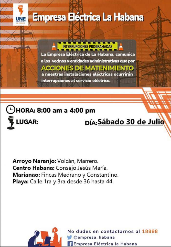 Interrupciones del servicio eléctrico en La Habana este 30 de julio