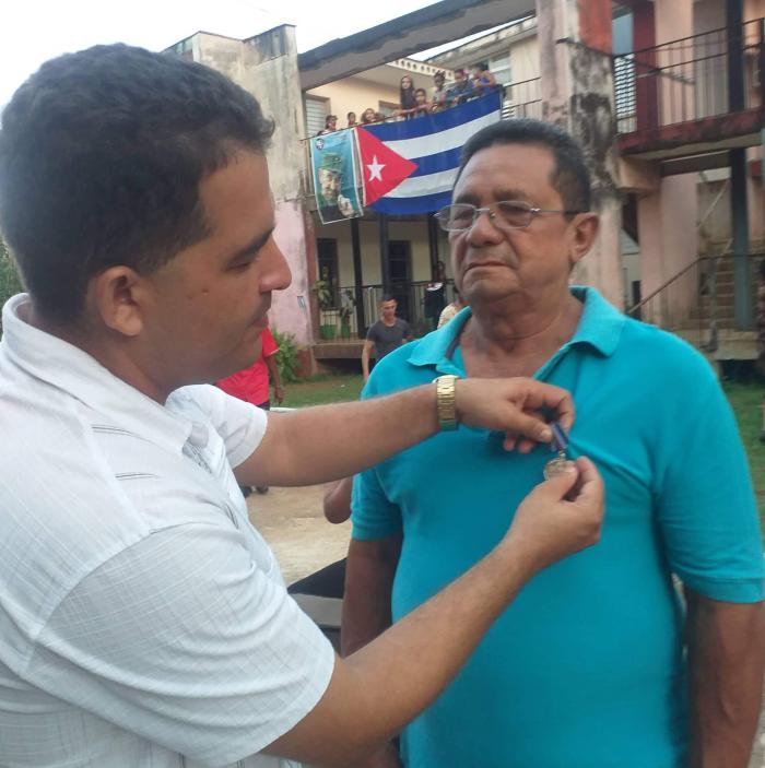 Eliades Rodríguez Martínez, miembro del Secretariado Provincial de los CDR, condecoró al cederista destacado Israel Pérez Espinosa, con la Medalla Por la Defensa de de la Patria y la Unidad del Barrio, por Decreto Presidencial 501 del 20 de Septiembre de 2022.