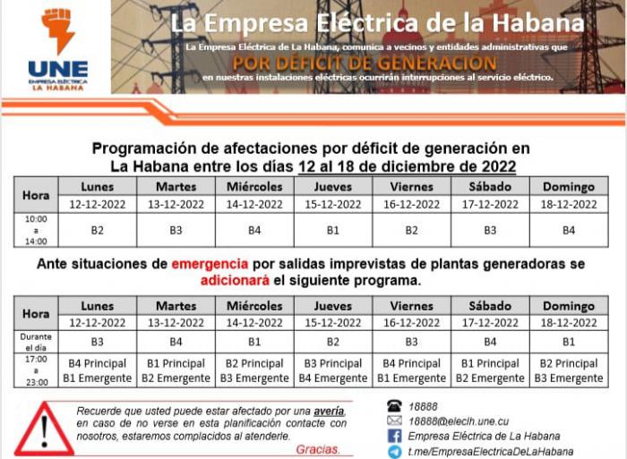 La Habana: afectaciones eléctricas del 12 al 18 de diciembre