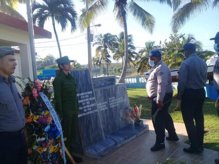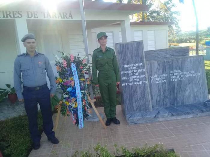 Una ofrenda floral al monumento que perpetúa la memoria de los mártires Orosman Dueña Valero, Rafael Guevara Borges, Yuri Gómez Reinoso y Rolando Pérez Quintosa, fue colocada por dos jóvenes combatientes de la PNR.