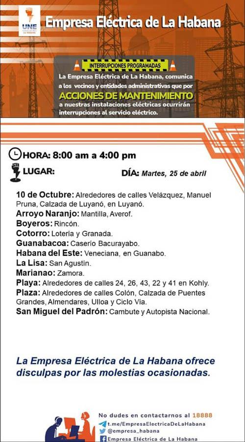 La Empresa Eléctrica de La Habana, comunica a los vecinos y entidades administrativas que por acciones de mantenimiento en las instalaciones eléctricas ocurrirán interrupciones al servicio eléctrico.