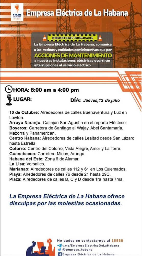 La Empresa Eléctrica de La Habana informa que por acciones de mantenimiento se interrumpirá el servicio eléctrico en los siguientes municipios de la capital.