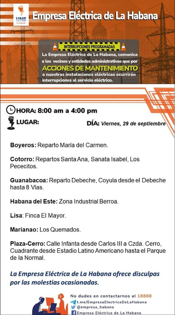La Empresa Eléctrica de La Habana informa que por acciones de mantenimiento se interrumpirá el servicio eléctrico en algunas zonas y repartos de la capital