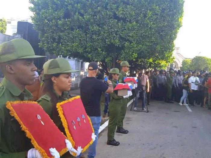 Ofrendas florales del General de Ejército Raúl Castro Ruz, líder de la Revolución y del Primer Secretario del Comité Central del Partido Comunista de Cuba y Presidente de la República, Miguel Díaz-Canel Bermúdez, presidieron las honras fúnebres de la primer teniente Yoandra Suárez López, y el combatiente Luis Alejandro Llerena Martínez, rescatistas del Cuerpo de Bomberos de Cuba caídos en el cumplimiento del deber, mientras laboraban en el edificio colapsado, de las calles Lamparilla y Villegas, del municipio capitalino de La Habana Vieja.