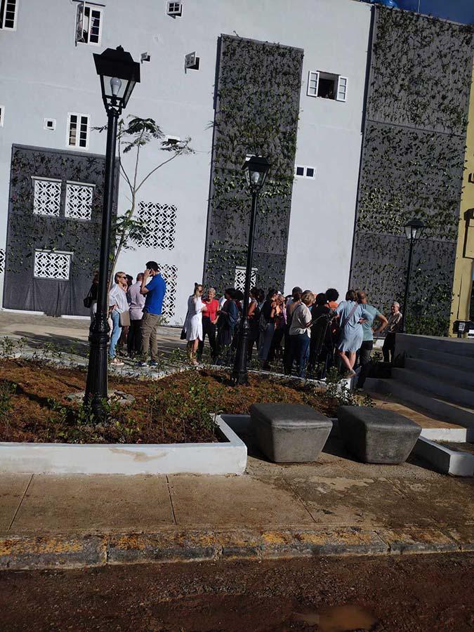 El periplo inició bien temprano, en la intersección de la Avenida del Puerto y el Callejón de Justiz, espacio yermo, que tras intenso laboreo, ha devenido parqueo automovilístico, multifuncional, en tanto ofrece la posibilidad de sentarse a descansar, disfrutar del paisaje o recrearse, contemplando el hermoso jardín vertical que decora la pared del edificio de viviendas, colindante.