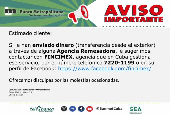 Sugiere a los clientes que han recibido la transferencia desde el exterior contactar con FINCIMEX, agencia que en Cuba gestiona ese servicio